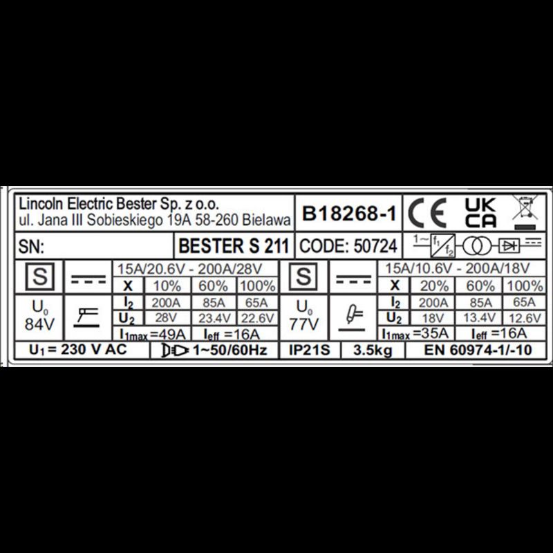 Caractéristiques du LINCOLN - B18268-1 Poste à souder inverter Bester S211